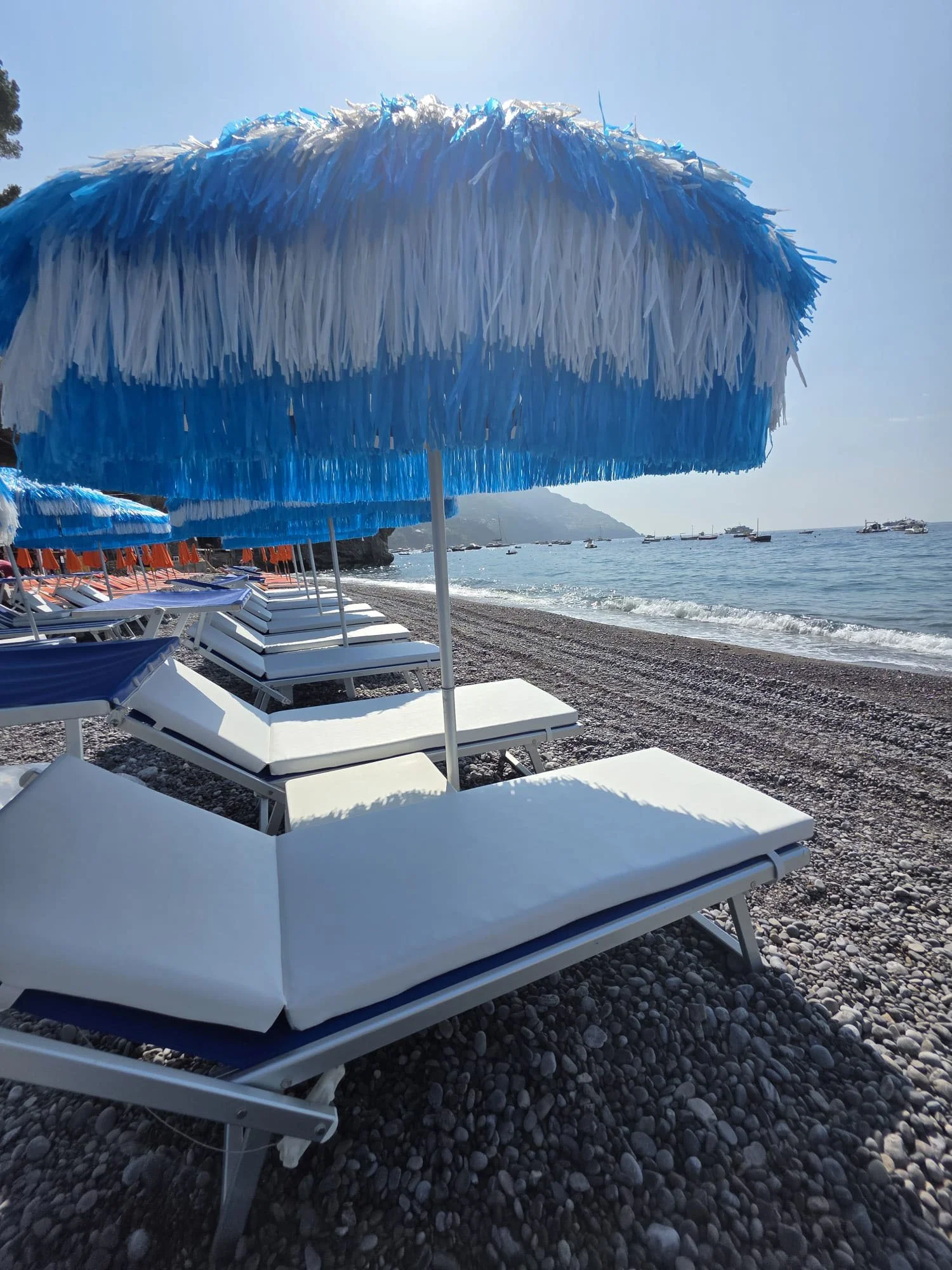 You will be seated on the second row of sunbeds, behind the front row closest to the sea.